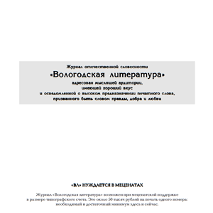 Печатные выпуски (№№'1-11) литературно-публицистического журнала «Вологодская литература» отличаются по содержанию от их электронной версии. Основные отличия версии журнала, представленной в электронном архиве: [1] сокращение содержания выпусков – изъятие отдельных текстов (некоторые произведения и материалы); [2] преобразование первых четырёх выпусков в два – сдвоенные номера: 1-2 и 3-4.