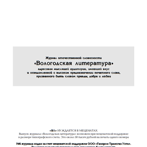 Вологодская литература : журнал отечественной словесности / гл..ред.: А..В..Николаев. — (2008–). — 2009, №'6 : август. — [Эл..версия изд.]. — Вологда : Изд. А..В..Николаева и А..С..Халова, 2009 ; [в тип. ПФ «Полиграф-Периодика» (Вологда)]. — 240 с. — 24.0×17.0 см. — [Тираж (печ..изд.): 450 экз.].