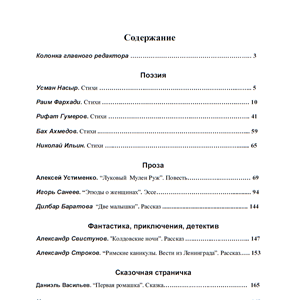 Слово : лит. альманах / Союз писателей Узбекистана ; гл..ред.: Р..Фархади ; редкол.: А..Свистунов, Т..Очередько (худож.), Е..Очередько (худож.), Н..Бондаренко, И..Семенюк, А..Наймушин. — (2021–). — 2023. Вып.'6. — [Эл..изд.]. — Ташкент : Совет по рус. лит-ре СП Республики Узбекистан, 2023. — 172 с. : ил. — 28.5×20.5 см [установоч. формат]. — 1.эл..экз. [архив. pdf-файл].
